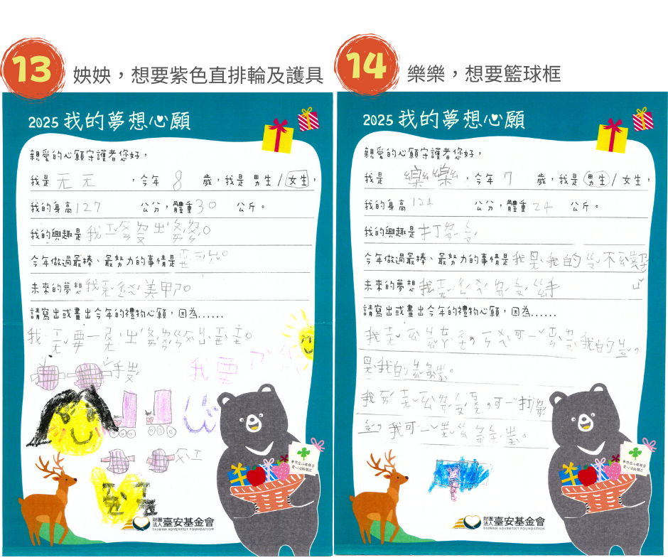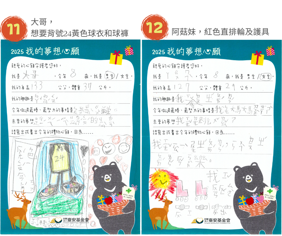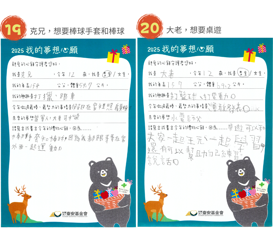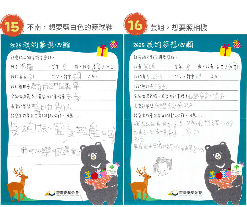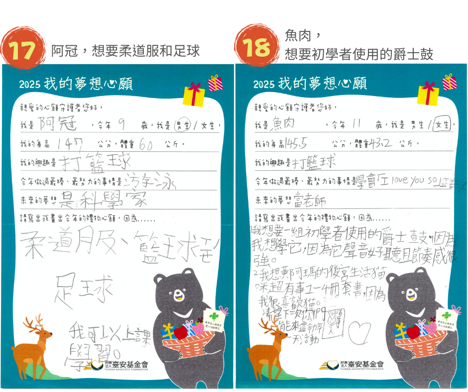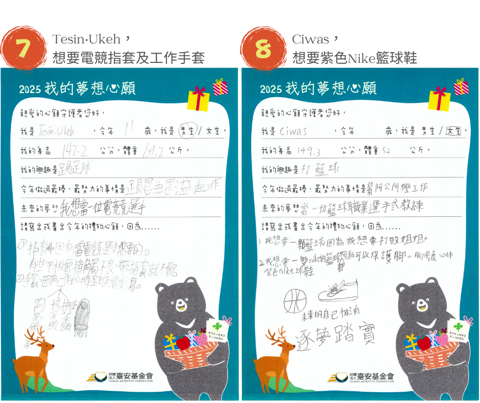 校本部及分校共20名學童,部落小校打造特色課程活化孩子的思維,尤其在科學教育上讓孩子奠下基礎,參加科學展覽訓練臨場反應。9歲的阿冠,未來夢想成為一名科學家,他嘗試多元體育活動,因此想要『柔道服和足球』; 9歲的恩宇,平時在農田幫忙爺爺奶奶搬東西,他最喜歡玩火車玩具,想要一組『行駛在鐵軌上的火車』,夢想著未來成為火車駕駛員;Ciwas想成為籃球職業選手,現在最想打敗的假想敵是姐姐,為了贏過姐姐,今年許下的禮物心願是『籃球及籃球鞋』,她希望未來的自己要築夢踏實。